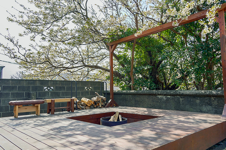 屋外スペースにはファイアーピットを設置しています。夜は焚き火の火のゆらぎを眺めながらじっくりと時間の流れを味わってください。もちろん、BBQもお楽しみいただけます。美味しい食材と美味しいお酒を心ゆくまでお楽しみください。